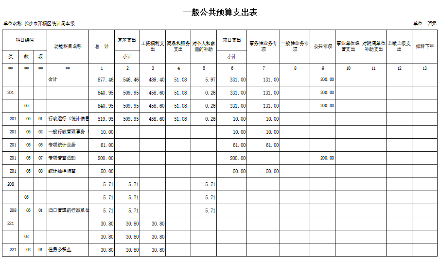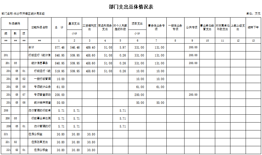 本部门预算为汇总预算,长沙市开福区统计局部门只有本级,没有其他预算单位,因此本部门预算仅含本级预算。